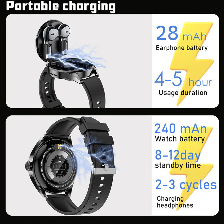 أحدث سماعات وساعة 2 في 1 بتصميم رياضي رقمي كاجوال، مع وجوه ساعة قابلة للتخصيص، أوضاع رياضية متعددة، شاشة عالية الدقة بحجم 1.46 بوصة، تقنية NFC، واجهة مستخدم متعددة للتبديل، قائمة جهات الاتصال، وقدرات الاتصال اللاسلكي.